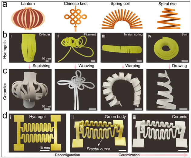受剪紙藝術(shù)以及智能材料的啟發(fā),研究人員想到,柔性水凝膠就是一種具有一定可變形性的材料,它能在加工或使用過(guò)程中展現(xiàn)出多樣化的性能。那么,能不能使陶瓷結(jié)合這種材料特性,像剪紙一樣“裁”成我們需要的形狀呢?