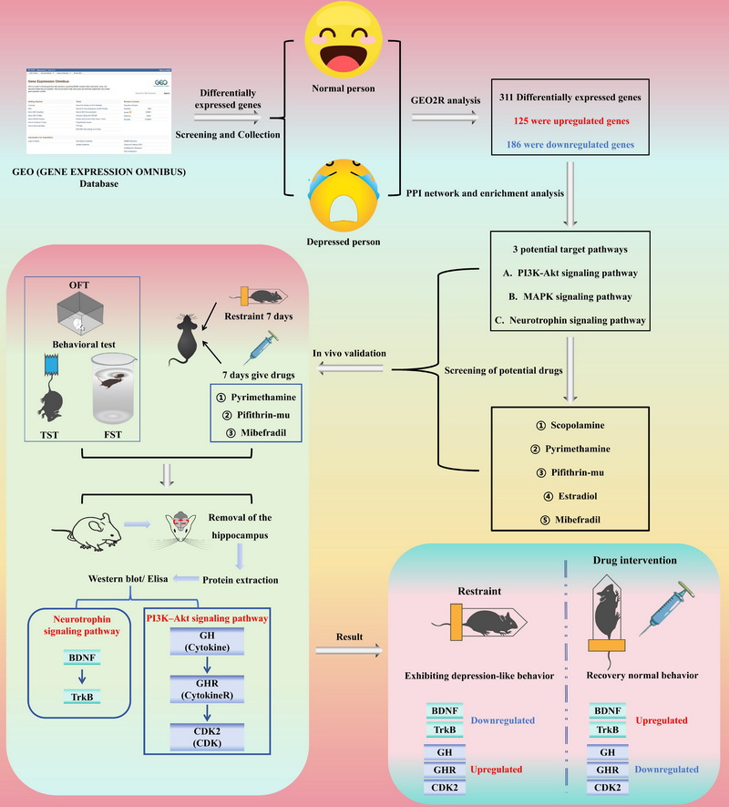 中國(guó)科學(xué)院西北高原生物研究所高原藏藥資源質(zhì)控與藥理毒理評(píng)價(jià)研究團(tuán)隊(duì)以抑郁癥患者基因表達(dá)數(shù)據(jù)為基礎(chǔ),先從GEO數(shù)據(jù)庫(kù)篩選出311個(gè)差異表達(dá)基因,經(jīng)加權(quán)基因共表達(dá)網(wǎng)絡(luò)分析、蛋白 - 蛋白相互作用網(wǎng)絡(luò)構(gòu)建及通路富集分析,發(fā)現(xiàn)這些基因主要富集于 PI3K-Akt、MAPK 和神經(jīng)營(yíng)養(yǎng)因子三大與抑郁癥發(fā)病相關(guān)的信號(hào)通路;隨后利用第二代 CMAP 平臺(tái),結(jié)合文獻(xiàn)調(diào)研篩選出3種候選小分子化合物(pyrimethamine,pifithrin-mu,mibefradil),通過(guò)分子對(duì)接實(shí)驗(yàn)驗(yàn)證,它們與上述通路關(guān)鍵蛋白(如 CDK2、TrkB 等)親和力高,部分滿足 “強(qiáng)結(jié)合” 標(biāo)準(zhǔn)(≤-7 kcal/mol);接著在慢性束縛應(yīng)激小鼠模型中驗(yàn)證 pyrimethamine,pifithrin-mu,mibefradil的抗抑郁效果,行為學(xué)測(cè)試(曠場(chǎng)試驗(yàn)、強(qiáng)迫游泳試驗(yàn)、懸尾試驗(yàn))顯示三者能顯著改善小鼠抑郁樣行為,效果與氟西汀相當(dāng);機(jī)制研究通過(guò) Western blot 與 ELISA 實(shí)驗(yàn)證實(shí),三者可調(diào)控 PI3K-Akt 和神經(jīng)營(yíng)養(yǎng)因子通路關(guān)鍵蛋白表達(dá)(降低 GH、GHR、CDK2 異常高表達(dá),上調(diào) BDNF、TrkB 表達(dá)),Pearson 相關(guān)性分析驗(yàn)證了通路調(diào)控與抗抑郁效果的直接關(guān)聯(lián),同時(shí)該研究還證實(shí) “老藥新用” 策略在抗抑郁藥物研發(fā)中的高效性,并建立 “多數(shù)據(jù)庫(kù)整合 - 多組學(xué)分析 - 體內(nèi)外驗(yàn)證” 的框架,成功挖掘出 3 種具有抗抑郁潛力的小分子化合物,為抑郁癥治療提供新候選藥物及作用機(jī)制參考。