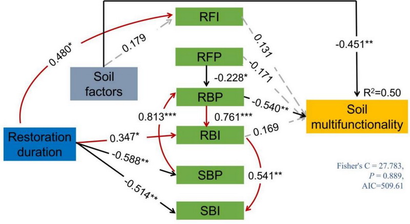 圖1 不同恢復(fù)年限的檸條(Caragana korshinskii)人工林下,恢復(fù)年限、土壤因子以及土壤和根際微生物群落特征對(duì)土壤多功能性的影響