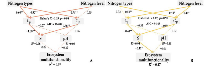 圖2 分段式結(jié)構(gòu)方程模型展示了各變量對(duì)生態(tài)系統(tǒng)多功能性的影響(A 長(zhǎng)期氮添加,B 短期氮添加)
