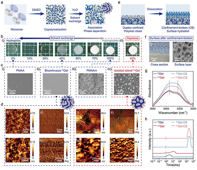 圖2. (a) 通過溶劑交換策略制備結(jié)構(gòu)可調(diào)線性共聚物水凝膠網(wǎng)絡(luò)的示意圖。(b) 不同MAAm含量(摩爾分?jǐn)?shù))水凝膠的宏觀光學(xué)照片。(c) 不同水凝膠的掃描電鏡圖像。(d)BiGel和IsoGel的原子力顯微鏡高度圖與相圖。(e) 表面限域破壞處理形成潤(rùn)滑層的示意圖。(f)?BiGel-CB截面掃描電鏡圖像,顯示梯度結(jié)構(gòu)。(g)?BiGel、IsoGel及其限域破壞后樣品表面的ATR-FTIR光譜。(h) 不同水凝膠的LF-NMR T?弛豫時(shí)間分布。