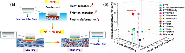 圖2. 泡沫鎳-聚四氟乙烯互穿相復(fù)合材料磨損機(jī)制及性能