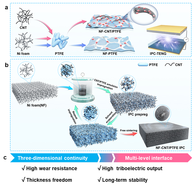 研究人員還研究了無機(jī)填料引入對泡沫鎳-聚四氟乙烯互穿相復(fù)合材料性能的增強(qiáng)機(jī)制,結(jié)果表明,碳納米管在三維微米泡沫鎳表面形成納米網(wǎng)狀結(jié)構(gòu),促進(jìn)了界面應(yīng)力傳遞與熱量耗散,顯著提升了力學(xué)強(qiáng)度與導(dǎo)熱性能。得益于泡沫鎳與碳納米管形成的三維微/納網(wǎng)絡(luò),復(fù)合材料輸出電流提高至1.5μA,是純聚四氟乙烯的30倍。摩擦起電響應(yīng)長效穩(wěn)定,與不同摩擦副具有普適性,展示了互穿相復(fù)合材料具備優(yōu)異導(dǎo)電特性,可作為高效能量收集的摩擦電材料。相關(guān)研究結(jié)果發(fā)表在Small(2025, 21(5):2409607)上。