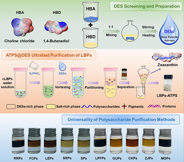 高效、精準的分離純化是開展多糖精細結構解析和活性研究的重大難題,而樣品前處理是多糖分離純化的重要基礎和前提。傳統(tǒng)多糖分離純化的樣品前處理技術包括脫脂、脫蛋白和脫色等過程,不僅操作繁雜、時間冗長,而且會導致多糖流失、結構變化和活性失活等。針對上述問題,課題組提出了將低共熔溶劑(Deep Eutectic Solvents,DES)引入雙水相體系(Aqueous Two-Phase System,ATPS)的新思路,構建了新型ATPS@DES多糖樣品前處理新體系,實現(xiàn)了枸杞多糖同步脫脂、脫蛋白和脫色;同時,在此溫和、綠色的條件下,實現(xiàn)了枸杞多糖高保留率和最大程度保持多糖的原始結構特征。