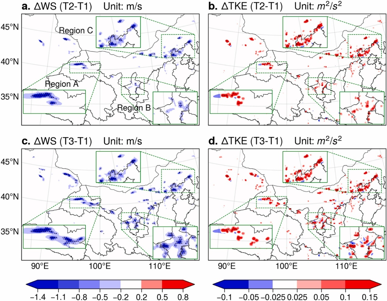 中國(guó)科學(xué)院西北生態(tài)環(huán)境資源研究院余曄研究員團(tuán)隊(duì),利用耦合風(fēng)電場(chǎng)參數(shù)化方案與動(dòng)態(tài)植被模塊的區(qū)域氣候模式,系統(tǒng)模擬評(píng)估了我國(guó)北方大規(guī)模風(fēng)電場(chǎng)群的潛在環(huán)境影響,揭示了風(fēng)電場(chǎng)群擾動(dòng)局地及區(qū)域氣候、進(jìn)而影響植被生長(zhǎng)的作用機(jī)制。