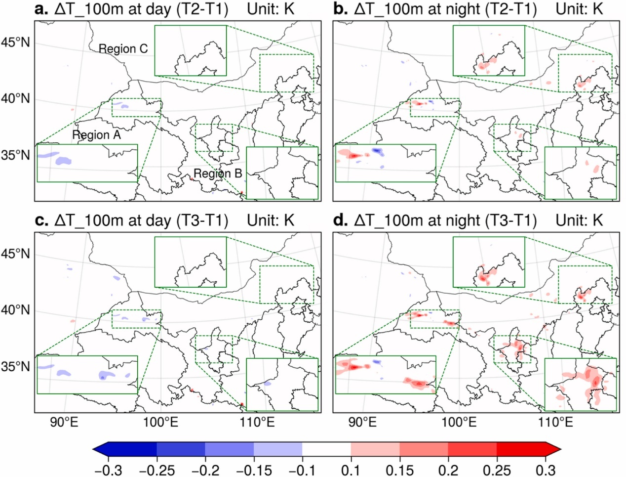 大型風(fēng)電場(chǎng)群對(duì)100米高度處年平均氣溫的影響(a, c)白天,(b, d)夜間